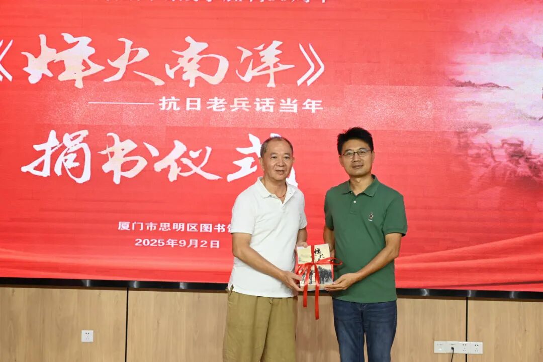 在全场的期待中,捐赠仪式紧随开场环节正式举行。主持人邀请郑毅夫先生留步,并请思明区文旅局二级调研员郑多达上台 —— 作为思明区图书馆的代表,郑多达接过《烽火南洋》书籍,完成了这场意义非凡的 “历史交接”。