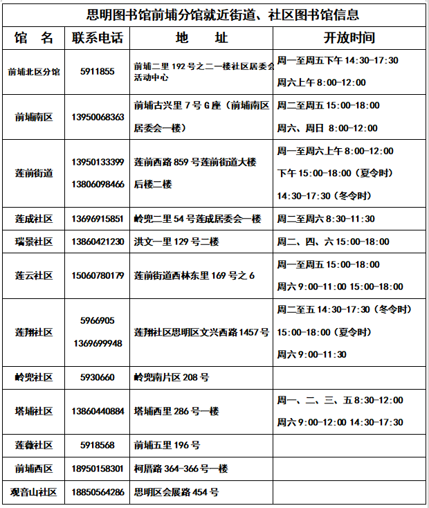 思明区图书馆前埔分馆因纳入征拆单位,于4月28日停止对外开放。如有读者需要进行借还图书,可至以下列表中的街道、社区进行借还书服务。