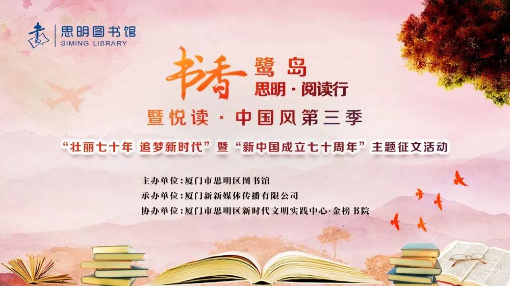 为庆祝中华人民共和国成立70周年,讴歌70年来的光辉历程,展现厦门市70年的发展成果和辉煌成就,充分展现新时代厦门人民的良好精神面貌。赞美新时代,描绘新征程,弘扬厦门精神。思明区图书馆特此开展“壮丽七十年追梦新时代”主题征文。