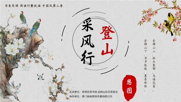 为创立创新阅读品牌,拓展阅读空间;充分挖掘思明区古代、近代著名人物,以此创立人文品牌,推进阅读联盟建设,思明区图书馆联合厦门新新媒体传播有限公司、金榜山社区居委会开展#书香思明|金榜山登山采风行#活动,打造独具特色的文化路线,建成靓丽的文化风景线。