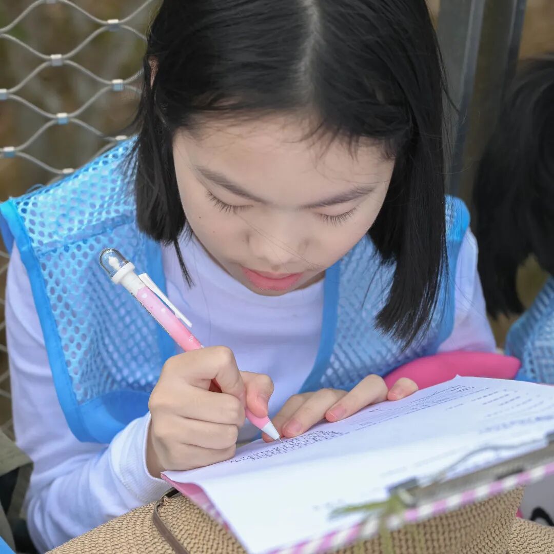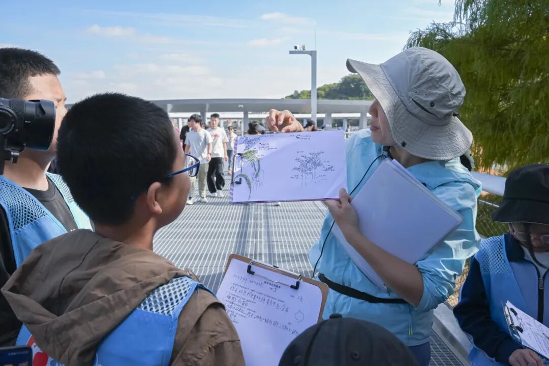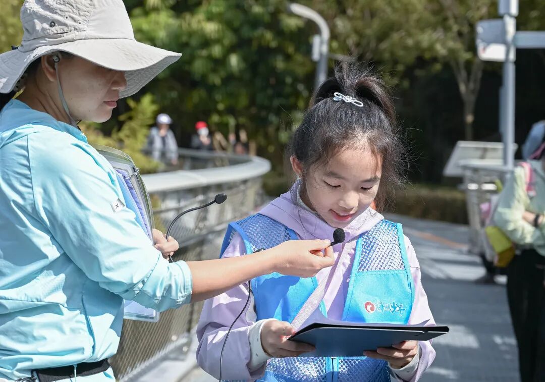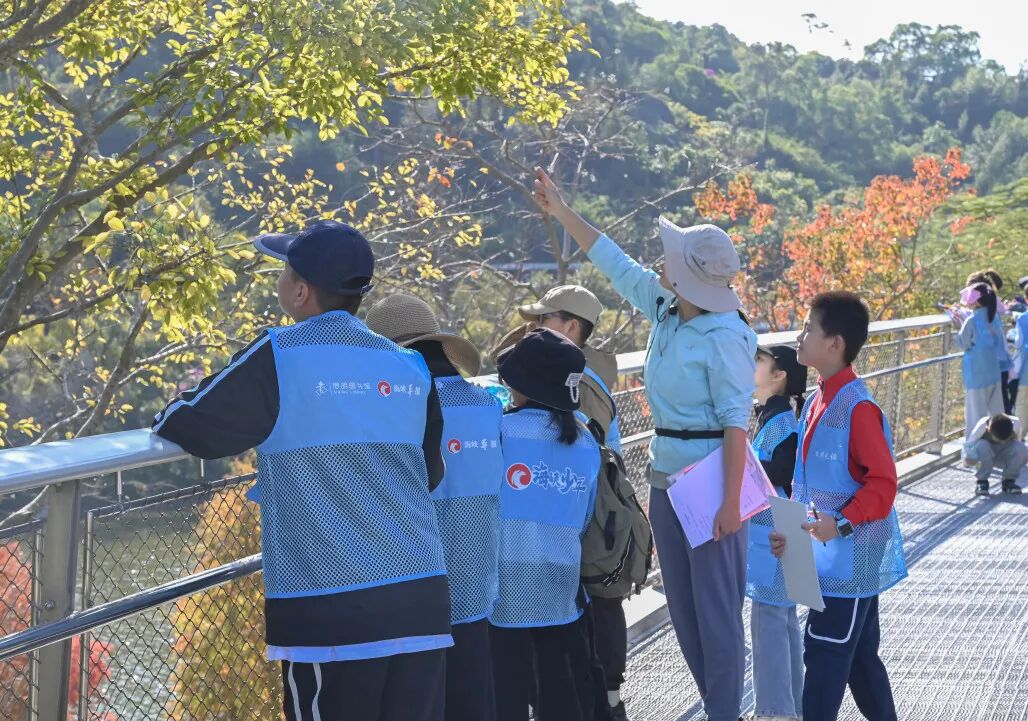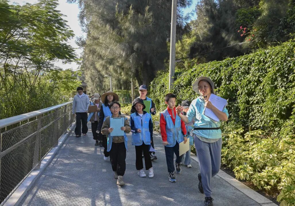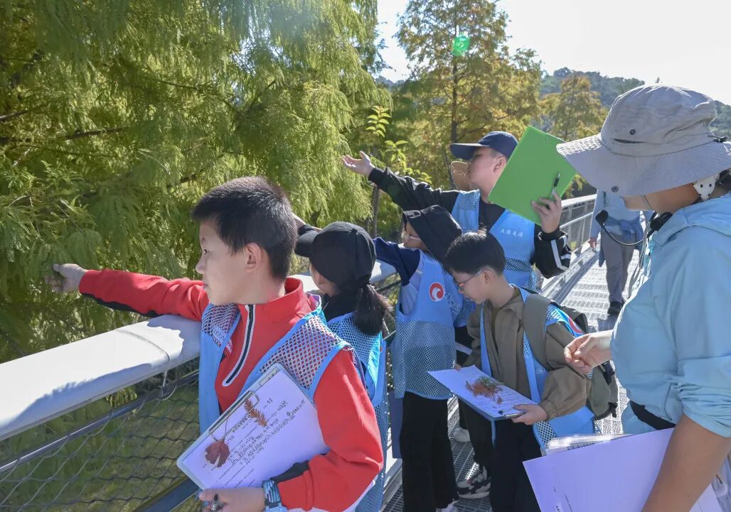 阳光穿过枝叶,在步道上洒下跳动的金箔,孩子们踮脚触摸叶片,感受 “秋日暖阳的触感”