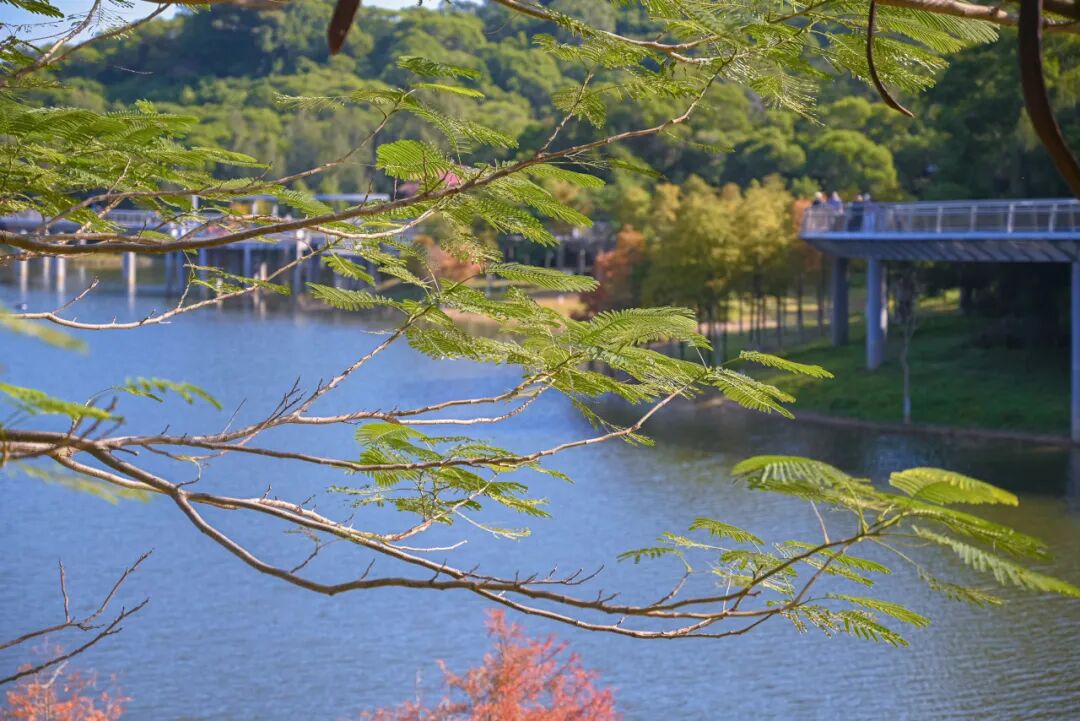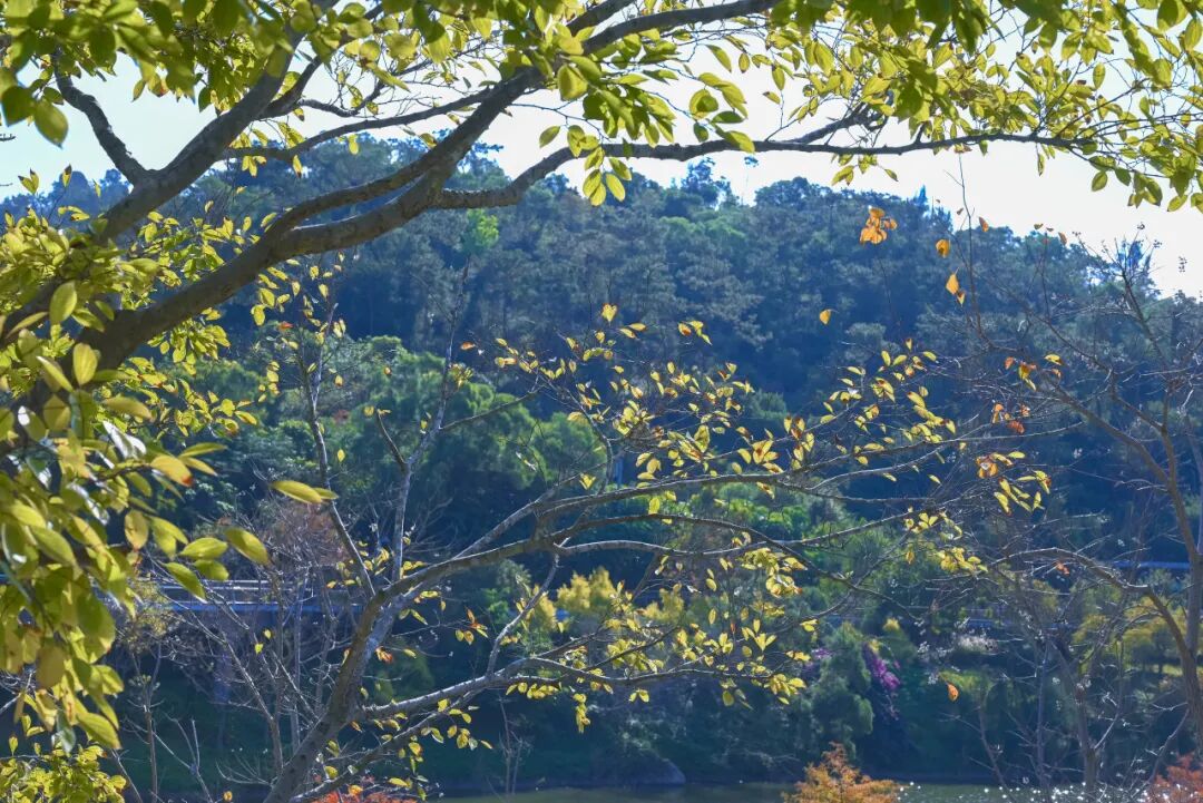 细辨叶片差异 —— 池杉叶细长如螺旋,垂落似绿色瀑布;落羽杉叶宽而互生,绿、黄、橙、红、褐五色交织,倒映水中宛如彩裙少女起舞。