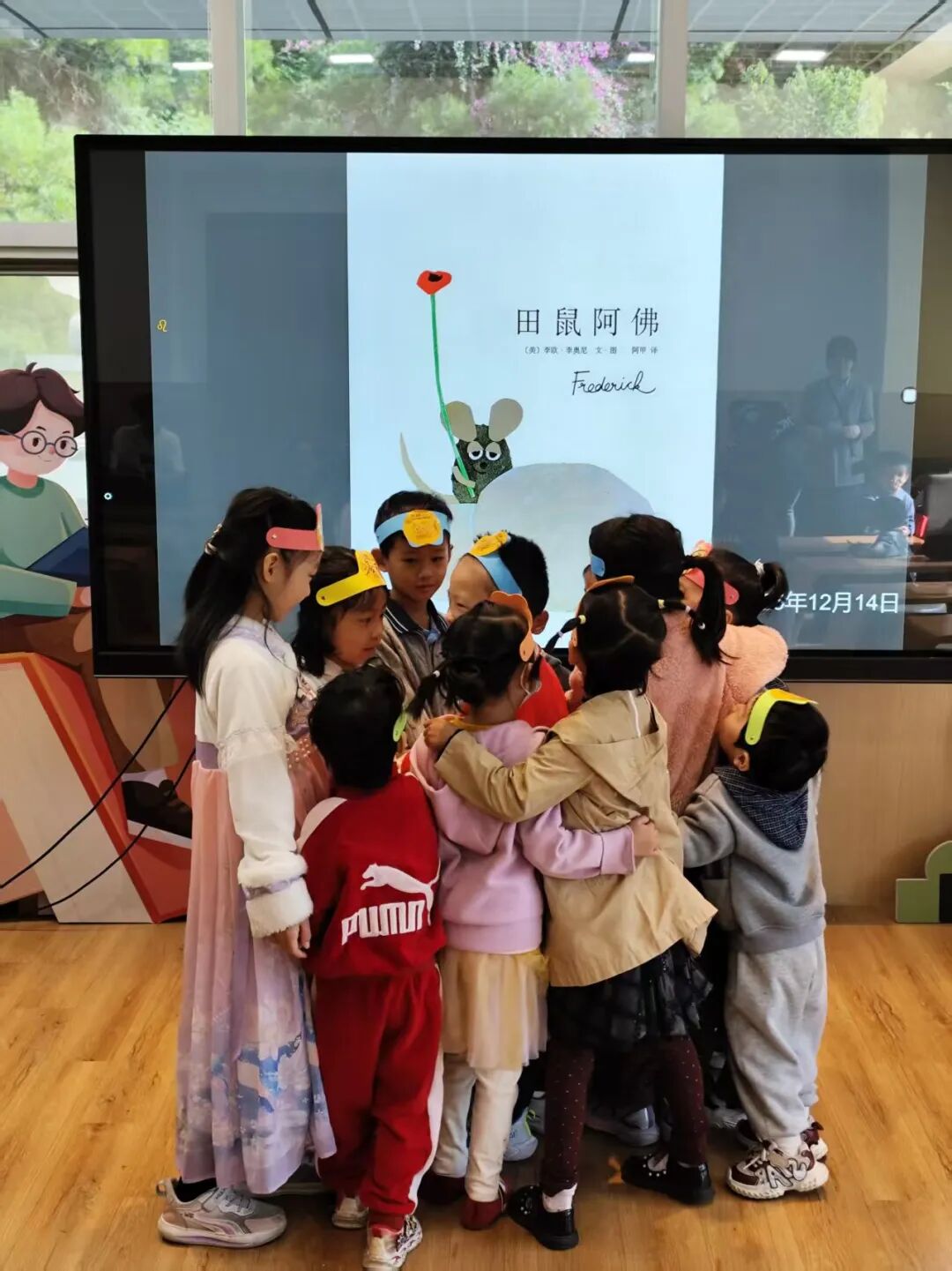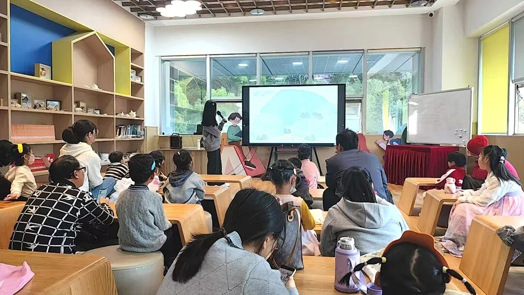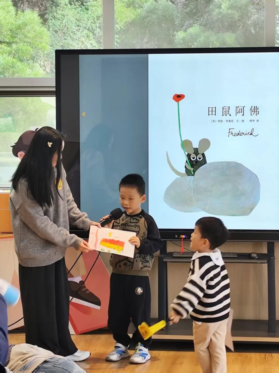 暖场游戏后,奇妙的绘本之旅正式开启。当讲到阿佛呆呆地望着草地,其他田鼠质问他为什么不工作时,老师向孩子们抛出了问题:“你们觉得,阿佛到底在做什么呢?”