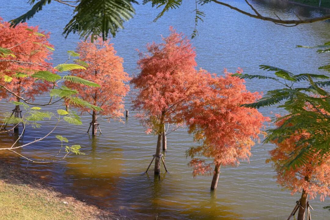 细辨叶片差异 —— 池杉叶细长如螺旋,垂落似绿色瀑布;落羽杉叶宽而互生,绿、黄、橙、红、褐五色交织,倒映水中宛如彩裙少女起舞。