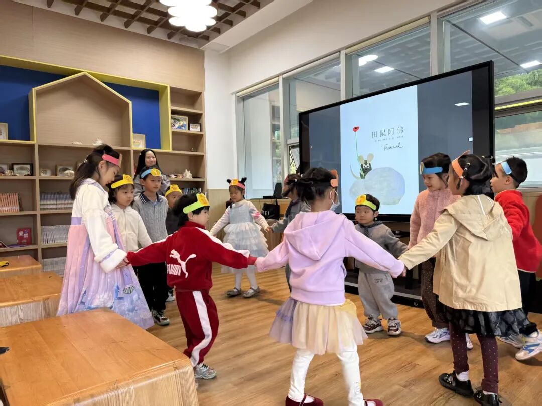 暖场游戏后,奇妙的绘本之旅正式开启。当讲到阿佛呆呆地望着草地,其他田鼠质问他为什么不工作时,老师向孩子们抛出了问题:“你们觉得,阿佛到底在做什么呢?”