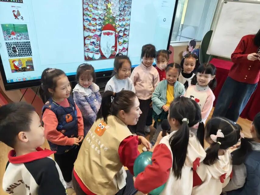 紧接着,宝贝们全程眼神发亮,跟着故事节奏时而紧张、时而欢笑,沉浸式穿梭在圣诞魔法小镇的奇妙世界里!“老师!我发现绘本里的圣诞老人的工作和衣服图案是一样的~” “这个圣诞老人他的鼻子和其他人都不同”课堂上,孩子们的小手举得像森林里的小树苗,一个个充满童趣的发现让老师频频惊喜。围绕绘本,我们设计了层层递进的互动问题,孩子们不仅积极抢答,还主动分享自己的独特见解,让绘本阅读变得更有深度。热烈的互动中,宝贝们不仅感受到了圣诞的温暖与美好,更悄悄 get 了 “分享让快乐翻倍” 的小道理,对“圣诞老人的责任:爱与分享” 有了超真切的理解~